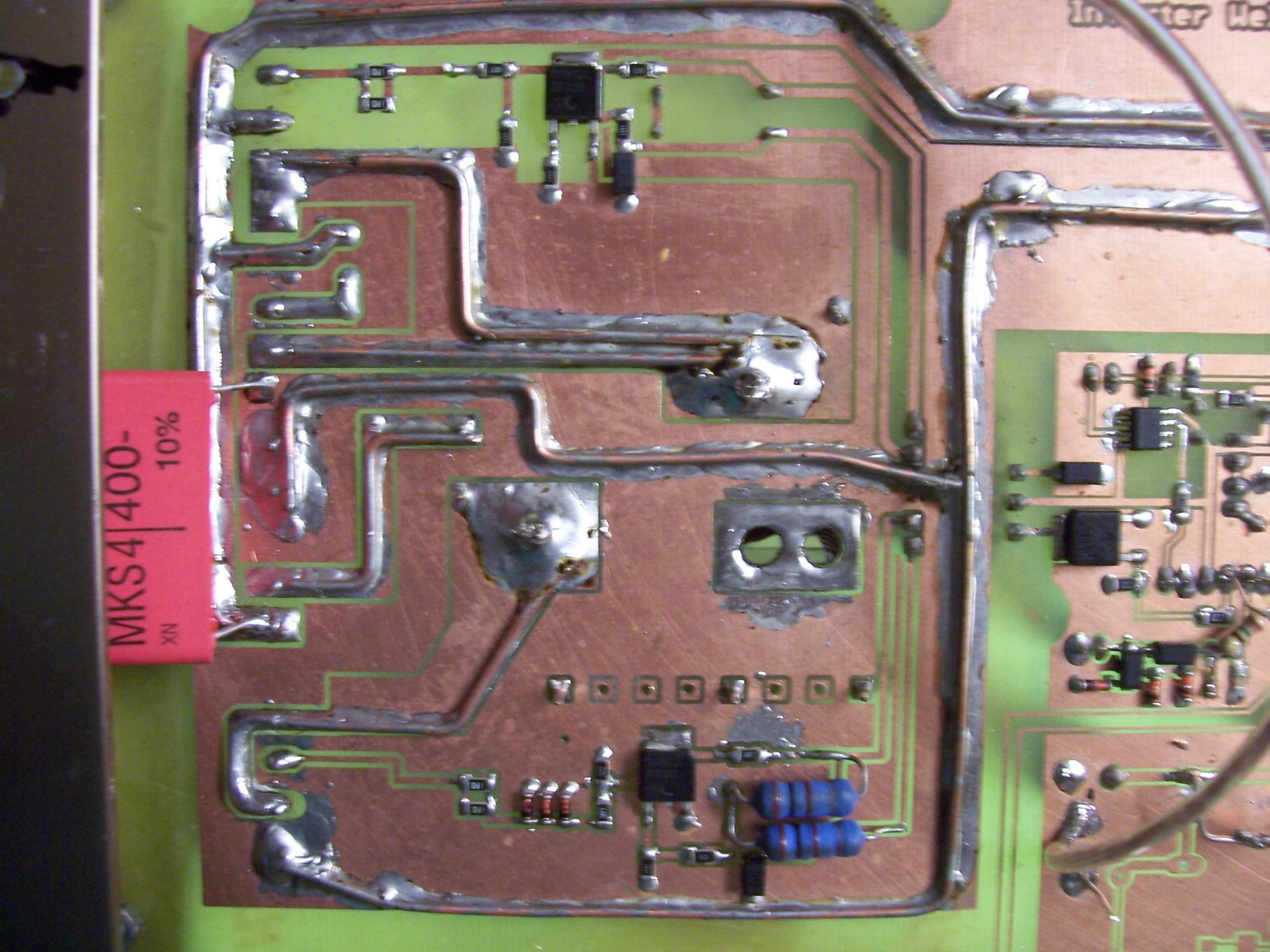 Egyelőre gyorsan itt egy kép. 1-2 óra múlva tudok majd kapcsolást is küldeni és ráérek mérni is. De a kapcsolás ezen része egyezik a maciéval. A diódák SS14 típusúak a FET-ek 20N03 típusúak. Az egyik oldalon smd zenerek vannak a másikon furatszerelt bzx85c13.
