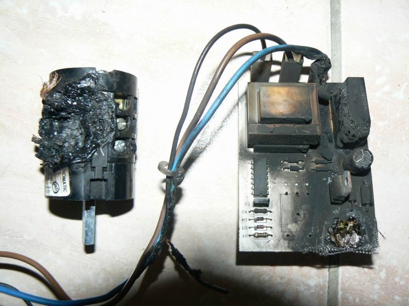 Még egy pár kép. És ha valaki szemfüles még azt is eltudja olvasni, hogy a kapcsolón szerepel, hogy csak Cu drót, de ez a gyártot csepet sem érdekelte. A kapcsoló éghető műanyagból volt, így lángra kapott és az elektronikát is szénné égette! Ilyen gyönyörű Co-k is vásárolhatóak kis hazánkban!