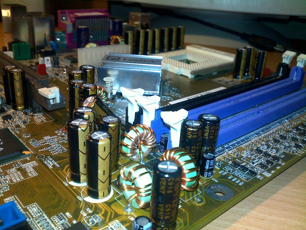.A vacak tápegység miatt nem púposodnak meg az alaplapi VRM-ek mögött lévő kondik. Ezek a VRM-ek a táp felől jövő bármiylen zajokra 60-90dB zajelnyomást produkálnak, és amíg át nem ütnek a félvezetőik, addig kizárt, hogy a tápegység akármilyen lengéseiből jusson a kimenetre akkora mértékben, hogy az káros legyen-eddigre már rég felégett az alaplapn egy sor egyéb alkatrész és a tápegység vezérlése is összeomlik rendszerint, tehát leáll esetleg diszkrét hang- és fényjelenségek közepette. A 29 kondi nem meglepő, a kondipestisnek nevezett eseményről a badcaps.net-en lehet részleteiben olvasni, a lényeg tömören az alacsony ESR kondik vízbázisú elektrolitjának anyaghiányos összetétele (a japánoktól lopott recept némileg félresikerült).