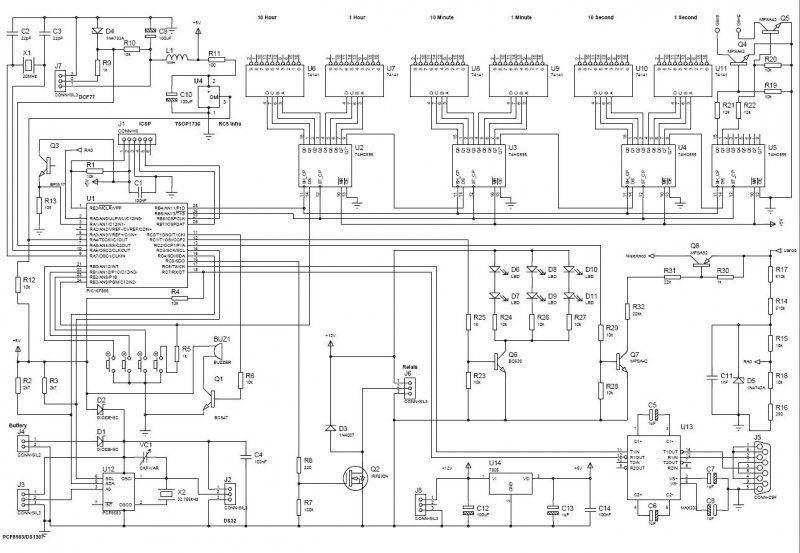 Vitaindítónak számom az alábbi rajzot, még ne tervezzetek panelt... Sajnos nincs szép nixie csöves és TSOP valamint DS32 szimbólumon a tervező programhoz. Megjegyzések: - Az RTC helyén a PCF8583 és a DS1307 is használható - a J3 a 3. láb eltérő szerepe miatt került a tervbe. - A J2 a DS32 csatlakozási pontja. - A TSOP1736 az infra vevő. - Q3 egy fototranzisztor a külső megvilágítás mérésére R13 értéke hozzá igazítandó. - BUZ1 egy belső oszcillátoros kerámia csipogó. - U14 7805 helyett lehetne kapcsoló üzemű tápot is használni, de DCF77 vételét ronthatja. - A rengeteg 100nF tápszűrő felrajzolásától eltekintettem - minden ic kap egyet - egyet. - D4 a szabadon hagyott DCF bemenetre kerülő nagyobb feszültségettől védi a pic -et. - R14.. R17 osztó segítségével a pic figyelheti az anód feszültség értékét, kikapcsolhatja a csöveket, ha túl magas/alacsony (255V -> 5V, osztása átállítható). D5 itt is a túlfeszültségtől védi a pic -et. - U13: MAX232 -t terveztem, de megoldható a feladat két tranzisztorral is. Az optocsatolást lehagytam. - A hosszú időre való kikapcsolás - nagyfeszültségű táp leállítása a még szabad RA3 -mal megoldható. - A legnagyobb kérdést hagytam utoljára: Az anód feszültség kapcsolása. Nem találok elég nagy feszültségű és áramú és főleg beszerezhető transzisztort Q8 helyére. Ide minimum 200 mA-es típus kellene, valamilyen nagyobb tokban a kapacitív terhelés miatt fellépő disszipáció miatt. Ha nem sikerül találni, akkor az R32, R31, R30, Q8 részt a hat csőhöz hatszor kell betervezni. Még egy kérdés: Ha a kapcsoló üzemű nagyfeszültségű táp egyenletes terhelésnél is sípol, a fényerő szabályzás nem fogja a sípolást modulálni és ezzel elviselhetetlen hangot eredményezni?