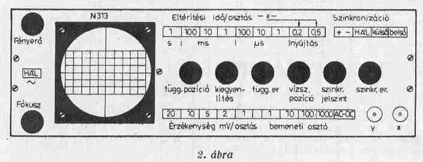 Az idővonal képernyő szélén látható görbülése a katódsugárcső geometriai torzítása miatt van. A geometria-korrekciós potméterekkel lehet javítani a vonalon.