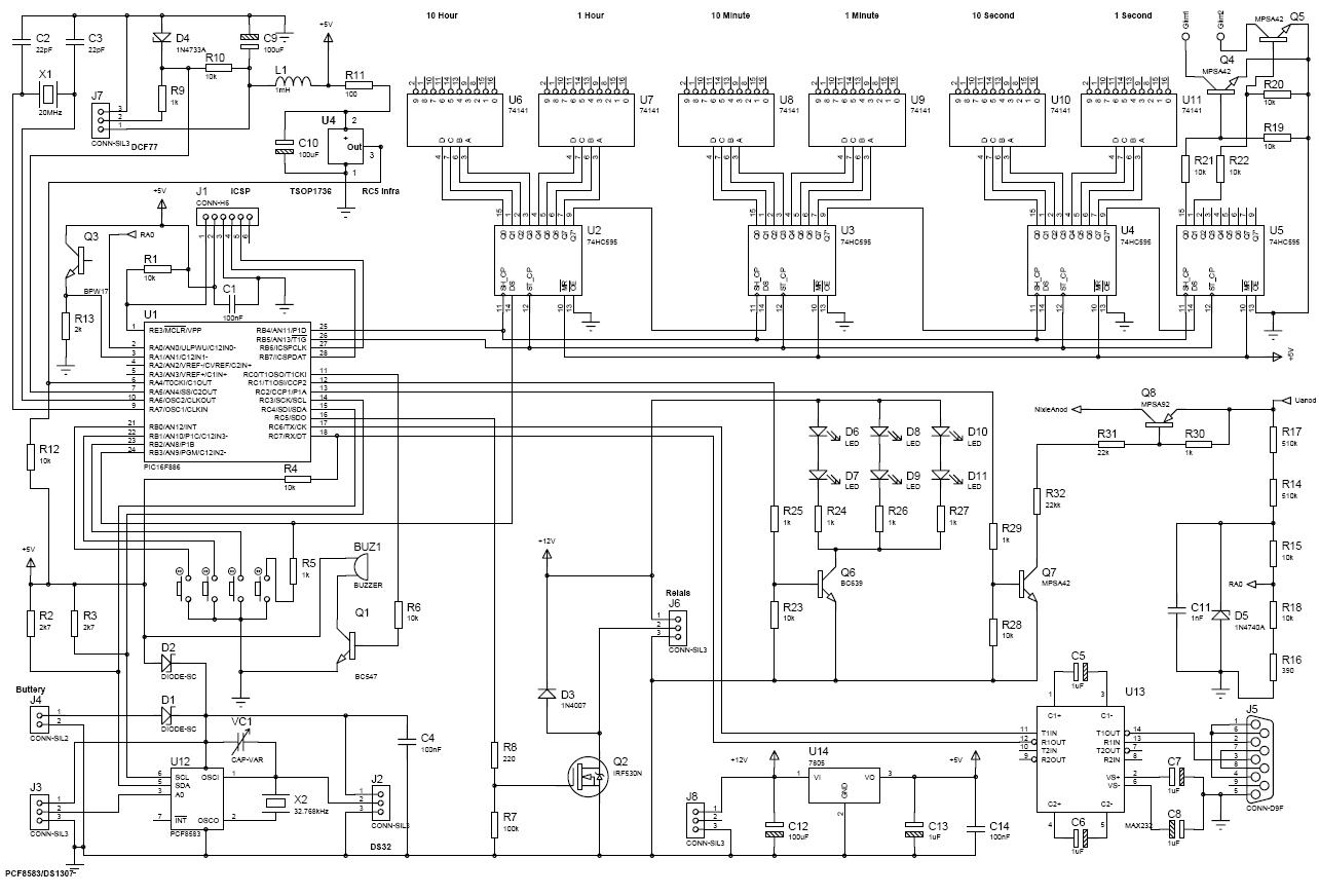 Vitaindítónak számom az alábbi rajzot, még ne tervezzetek panelt... Sajnos nincs szép nixie csöves és TSOP valamint DS32 szimbólumon a tervező programhoz. Megjegyzések: - Az RTC helyén a PCF8583 és a DS1307 is használható - a J3 a 3. láb eltérő szerepe miatt került a tervbe. - A J2 a DS32 csatlakozási pontja. - A TSOP1736 az infra vevő. - Q3 egy fototranzisztor a külső megvilágítás mérésére R13 értéke hozzá igazítandó. - BUZ1 egy belső oszcillátoros kerámia csipogó. - U14 7805 helyett lehetne kapcsoló üzemű tápot is használni, de DCF77 vételét ronthatja. - A rengeteg 100nF tápszűrő felrajzolásától eltekintettem - minden ic kap egyet - egyet. - D4 a szabadon hagyott DCF bemenetre kerülő nagyobb feszültségettől védi a pic -et. - R14.. R17 osztó segítségével a pic figyelheti az anód feszültség értékét, kikapcsolhatja a csöveket, ha túl magas/alacsony (255V -> 5V, osztása átállítható). D5 itt is a túlfeszültségtől védi a pic -et. - U13: MAX232 -t terveztem, de megoldható a feladat két tranzisztorral is. Az optocsatolást lehagytam. - A hosszú időre való kikapcsolás - nagyfeszültségű táp leállítása a még szabad RA3 -mal megoldható. - A legnagyobb kérdést hagytam utoljára: Az anód feszültség kapcsolása. Nem találok elég nagy feszültségű és áramú és főleg beszerezhető transzisztort Q8 helyére. Ide minimum 200 mA-es típus kellene, valamilyen nagyobb tokban a kapacitív terhelés miatt fellépő disszipáció miatt. Ha nem sikerül találni, akkor az R32, R31, R30, Q8 részt a hat csőhöz hatszor kell betervezni. Még egy kérdés: Ha a kapcsoló üzemű nagyfeszültségű táp egyenletes terhelésnél is sípol, a fényerő szabályzás nem fogja a sípolást modulálni és ezzel elviselhetetlen hangot eredményezni?