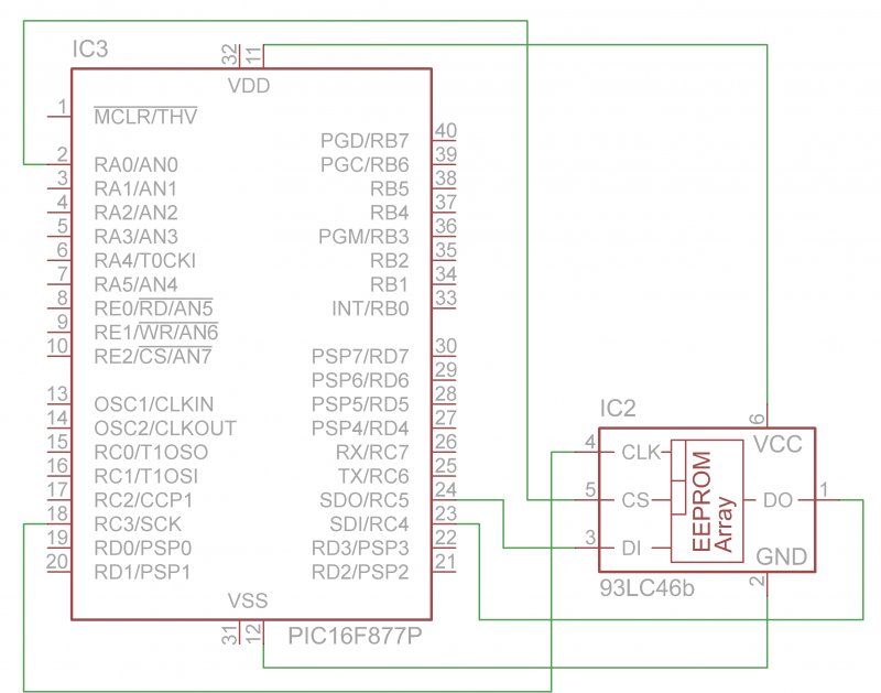 Egy 93C46B eepromot szeretnék PIC16F877 tel kezelni. A problémám, hogy bármit küldök neki nem történik semmi. Próbáltam PICKIT2 vel adatot beleírni, az rendbe ment. Az így beírt adatot se tudom a piccel kiolvasni. A bekötést és a forrást mellékelem. Az eeprom jól van így bekötve? Van esetleg valakinek működő forrásrészlete ehhez az eepromhoz? A segítséget előre is köszönöm.