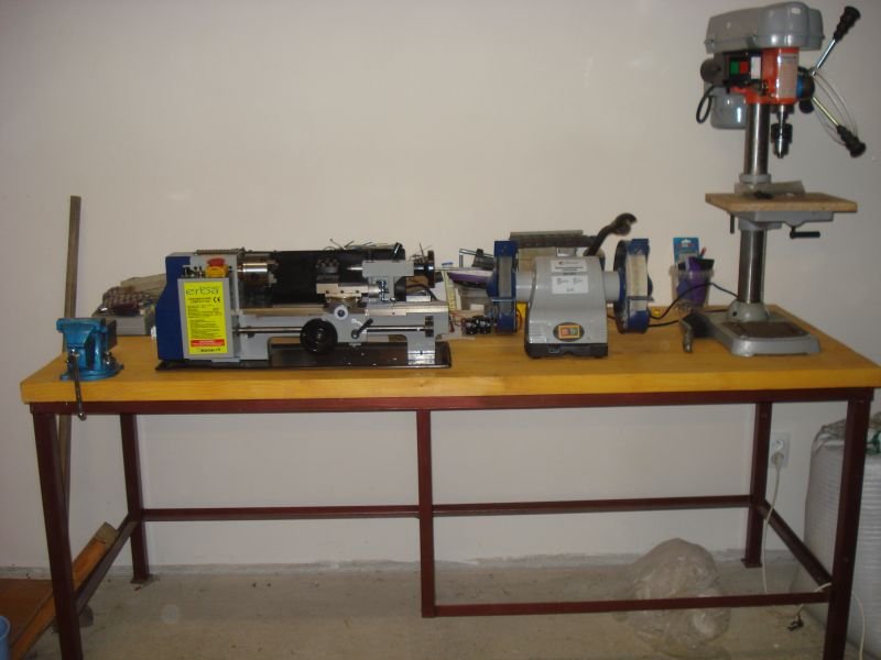 Lassan nekem is készülget a műhelysarkom,ez most a vasas részleg,de jobb híján itt kell a forrasztós melókat is végeznem.Az eszterga csak a kép kedvéért került elő,egyébként el van rakva a dobozába.Az elektromos részleg még a szüleimnél van ,ami 280 km innen,de egyszer az is ide kerül,akkor teljes lesz a kép.Addig marad az alukofferes szerszámcipelés oda,ahol épp vagyok.