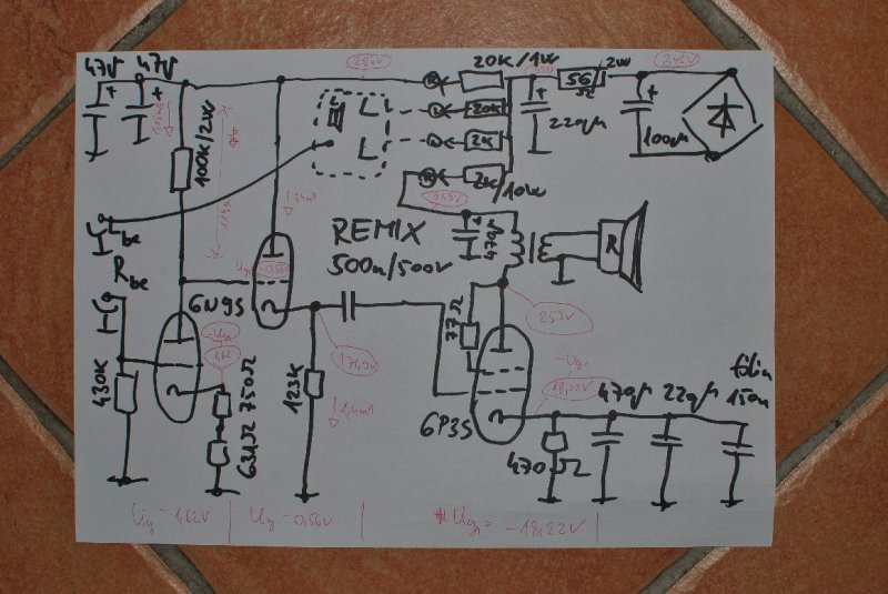 Összesítve a 6P3S dolgokat az első rajz a tetródás módban csúnya hangú erősítő a másik rajzom amit az elmúlt 2 hét és a mostani hétvége alatt fejlesztettem, főleg fülre, de DC munkapontok mérve karakterisztikákon keresgélve, négyszögjelmérve, aztán fül fül fül...Szóval nagyon jó lett, az alapállapotért hiába a sok drága alkatrészt nem adtam volna 30e ft ot sem hiába több az anyagár, ha időben meghallgatom sokféle zenén... Szóval a trióda módban teljesen visszacsatolatlanul hihetetlen lineáris. Igaz a gyári ajánlást tartottam, és itt is volt a nagy meglepi BÍRJA a 310V ot is trióda módban azaz Ug2 is fent 310 V on, és igaz, hogy így szkópon még szebb a négyszög, és 1,9W ot lehet kiszedni belőle, de a fül a fül a fül...Szóval 250V os Ug2 és Ua esetén igaz, hogy rondább, túllövéses a négyszög (csak egy iciri picit) és csak 1,2W ot lehet kiszedni, ami pont elég, ha több kell igazi trióda kell. De hihetetlenül szól, néha oda kell kapni az embernek a fejét, hogy ez itt pendült-zörrent-stb. Nagyon jó. Szóval csatolok egy rémes hangú tetródás rajzot, amit semmiképp ne építsetek meg, és egy igazán jó hangú Trióda mod-ba kötött rajzot, ezt viszont lehet utánépíteni. Persze a végén a felírt feszültségeket nem árt ellenőrízni, valamint az áramokat, mert nincs két egyforma cső. Azért a megfelelő minőségű alkatrészbázis sokat jelentett, pl egy látszati kép az eredményről, amin látszanak az 50-60 éves ellenállások, és a csatolókondi ami valami olajpapír ill fémezett papír de minimum valami fólia. Ha valaki próbálkozik a sok kondi a kondis fotón 500Ft/db ill van ami fülre pározott azok 1000Ft/2db amik egymás mellet vannak, igaz azok 10 mikrósak...