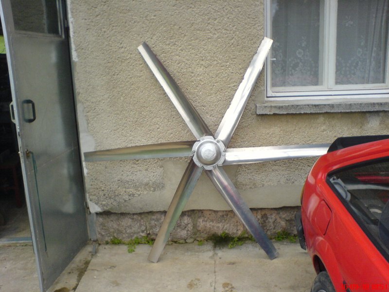 Természetesen kiegyensúlyozom, mert így ebben a gyenge szeles időben meg sem mozdul. Két lapát van fenn, bosszúságomra, mert így kettőre kell nehezéket tegyek, kiegyensúlyozás végett. Arra is gondoltam, hogy felmegyek a láncfűrésszel, de elvetettem a gondolatot, nehogy úgy járjak mint a sajt amit a róka osztott két egyenlő részre. Holnap, ha sikerül, kiegyensúlyozom, nehezékekkel. Látnák már némi mozgást és neki állnák komolyabb profilú lapátoknak. A deszka, mint írtátok, nem tűri a csavarást, de ha elvágnám három helyen, és minden lapátdarab különböző szöggel állna széllel szemben? Mi a véleményetek? Úgy a vége sem lustálkodna és a töve sem fékezne. Vagy forditva.