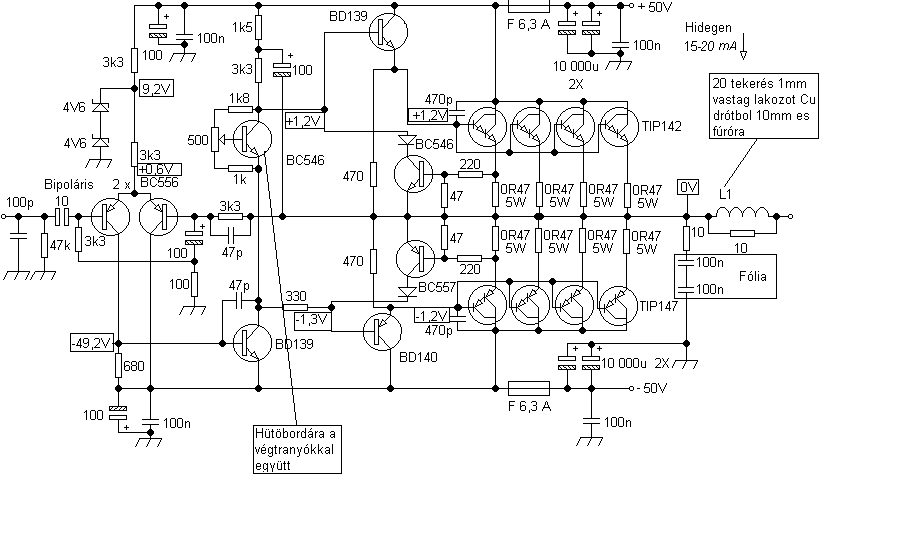 Valóban sok hasonlóság van ebben a kapcsolásban is de az ötletet nem ebböl meritettem,ezt a kapcsolást még ép nemlláttam.A neten végig keresgettem legalább 100 féle kapcsolást,sokat tanulmányoztam öket,párat megis épitettem,próbára,azért hogy aztán megtudjam épiteni a legegyszerübbet de egyben a lehetö legmegfelelöbb kapcsolást.A kapcsolásban amit megépitettem nemmutattam be semmi újatde a cél nemis az volt hogy dicsekedjem csak megakartam mutatni,hogy olcsó alkatrészekböl is könnyedén lehet nagyobb teljesitményre összeállitani hangminöségben nemutolsóként álló erösitöt,hisz ez egy szokványos erösitö rajza ezt nemis vitatom és nemis állitom hogy kizárólag az én találmányom,mivel az ötleteket és a kapcsolási módokat a jól bevált módszerek szerint épitettem,ezen már nincs is mit újat kitalálni,legfeljebb a felhasznált eszközökell,kapcsolás módokkal lehet kombinálni.De pont ebben a kapcsolásban teljes mértékben én állitottam igy öket össze,fejböl bármikor leis tudom rajzolni pont igy,azóta már a nyák terve is megy .Szeretem a darlington tranyókat,nemtudom miért de keményebb mélyeket és szebb csengésü éleseket tud produkálni,persze gerjedékenyebb is amit a kondenzátorok elháritonak.