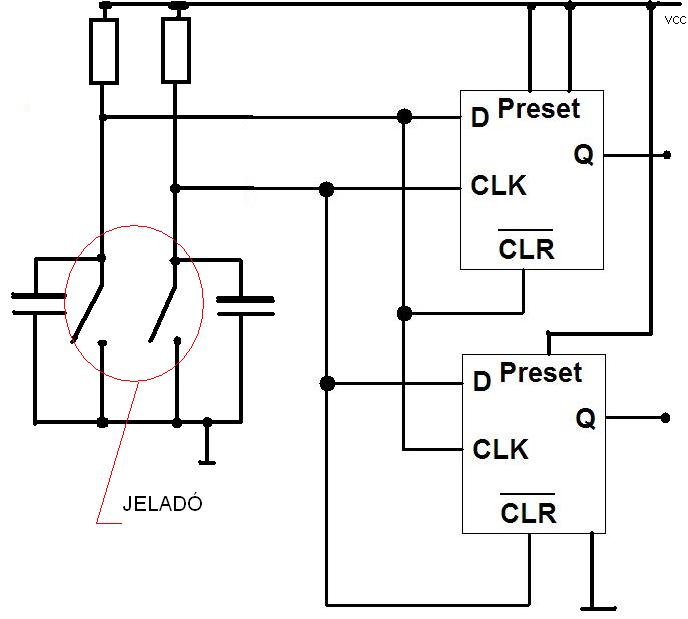 Helló , én tálátam erre egy egyszerűbb megoldást 7474-es ic szintén de egyszerűbben . A Preset láb tápra kötve . Az encorderre egyenként egy 4,7 mikros kondenzátor pergés mentesítéstre . Persze még jelillesztővel (pl: Smith t.) kikell egészíteni ....