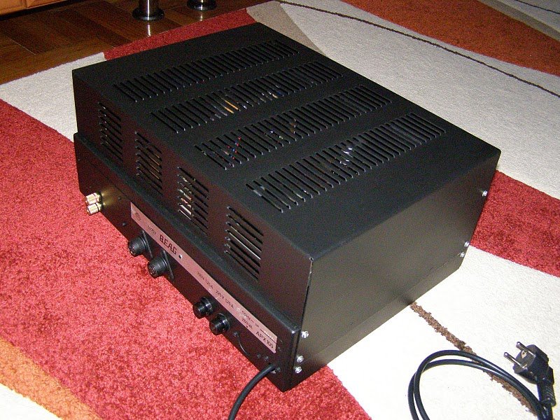 Ma elkészült a második APX100-as erősítőm felújítása. Elég különös módon került hozzám. Át volt alakítva 6p3s-re, a VR150 stabilizátor cső helyén egy Z-dióda volt, egy ormótlan hűtőbordán. A hálózati trafó szigetelése meg volt bontva, és a 2db 6p3s fűtése ami összesen 2A igényel, a szerencsétlen 6,3V-os ágára volt kötve. Ez mind az előző tulajdonos 'kókány' munkája volt. Első feladatom az erősítő áramkörének helyreállítása volt. Kapott két új magnovál foglalatot és két új PL509-es csövet. Természetesen ezt is újból be kellett kötni. A Z-diódát kivettem, és kapott egy VR150 stab. csövet. A puffer kondenzátort is kicseréltem benne. Új kimenőt nem tekertettem hozzá, mivel nagyon olcsón tudtam szerezni egy APT100 kimenőtrafót. Ezt egy kis szerelvényen az erősítőbe szereltem. Az APX 100V-os kimenetét az APT 100V-os szekunderére kötöttem, így a primerre 4-8Ohm-os hangfal köthető. Az erősítő bekapcsolás visszajelző lámpáját LED-esre váltottam. Illetve az előlapon egy nyomógombot helyeztem el, ami bekapcsolja az anód feszültséget. Az erősítőn belül van egy relé öntartó kapcsolással. Ha a nyomógombot megnyomjuk a relé behúz, és egyúttal bekapcsolja az anód feszültséget is. Az erősítő kikapcsolásával a relé elenged.