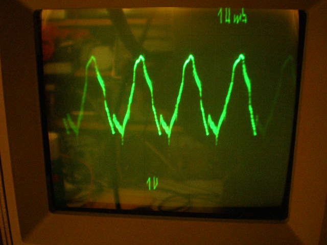 Ez is még besorolható a normális működésbe, pont akkor készült a kép exponálása alatt a sugár pont kiment a kép háromnegyedétől, és indul elöröl. Ha már sugár szinusz rondaság verseny. Kézzel fogott méröcsucsúcsal csináltam egy képet. Az előző egy transzformátor szekundere volt.