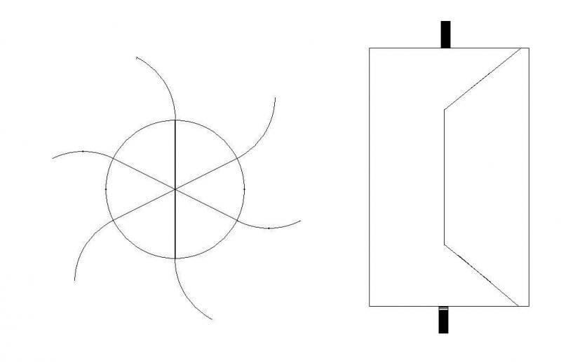 Tegnap nagyon jó szél fújt. Nagyobb, mint amilyentől elvárnám, hogy működtesse a gépem. Ez a szélerő arra sem volt elég, hogy szélirányba állítsa a gépem. Sebaj, felmásztam és kikötöttem. Úgy már volt némi aktivitás, de csak a hat másodpercenkénti egy fordulatot tartotta, amikor tudta. A földön, amíg szerelés alatt volt kézzel, úgy megtudtam hajtani a tengelyt, hogy egy 12 V, 21W-os égő teljes fényével világított. Ott fenn, még meg sem pirosodott a fűtőszál. Arra az állványra egy pillepalack forgót is tettem, amelyik forgott mint a mérgezett egér. Mivel a pillepalack szépen forog, lenne egy kérdésem azokhoz akik már kipróbáltak hasonló szélkereket. Nagy vonalakban vázolnám, mire gondolok és mellékelek egy rajzot is. Egy 220 literes bádoghordó kerülete (az iskolában palástfelszínnek neveztük) 180 cm. Hat egyenlő távolságra hosszanti bemetszést végeznék és kifordítanám a 30 cm-es lemezrészt, hogy felül, vagy alulnézetből a mellékelt ábrához hasonló legyen. Így egy függőleges tengelyű szélkereket kapnák. Valaki,aki próbált hasonlót építeni, kérem válaszoljon.