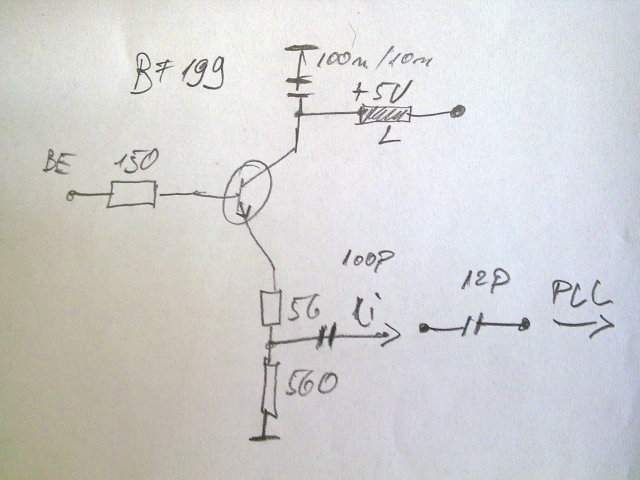 Sziasztok ! VCO kicsatolas problemat elovettem. A kepen lathato formaban emitterkovetovel sikerult kicsatolni a VCO-t a PLL fele. Ami a rajzrol lemaradt az a bazison levo ~1cm hosszu ferritgyuru. Vetelnel a kulonbseg az elozo kicsatolashoz kepest annyi, hogy eltunt az alacsonyfrekis zaj. (Korabban volt egy nem tul eros 50Hz koruli zaj.) A vett kepen lathato kulonbseg nincs.
