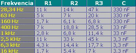 . Szovval en Ebbol kell epitsek 2 ot , mert ahogy latom az ic sztereo . Csak egy baj van eddig nem tudom a labak szamat ? Es abbol a tablazatbol meg az egyik ilyen szuruaramkorre rakotom a : melyhez : 28,34 Hz Kozephez : 1 KHz Es a masik szuroaramkorre : magas : 16Khz Jol ertettem ? Bocsanat a tul sok kerdesert , biztos akarok lenni abban amit csinalok , mert nincs sok idom vacakolni vele
