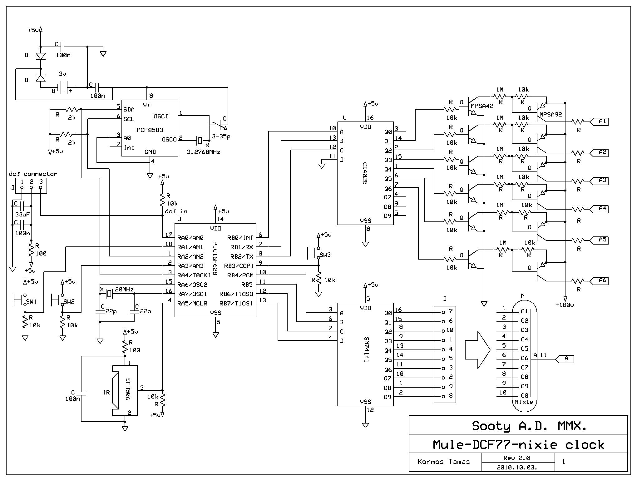 A megépített Mule 1.3 Nixie óra valóban nagyon jól működik, de nálam is az a baj, hogy kapcsolós a konnektor, vagy kevés a hely. Itt szerintem elegendő az alap f628, vagy f648 kontroller, (nincs szöveg megjelenítés, nincs analóg mód sem, stb.) . Az elgondolás onnan jött, a Wand és propeller programok itt is nagyon megfelelnének az RTC, ill. a távirányítás lehetőségével, a DCF77 szinkron már úgyis megvan. Természetesen jóval szerényebb tudással, talán ötvözhető lenne az emlitett órák programjaiból. Ez lehetne a ”nagy projekt” kistestvére, amelyet lényegesen egyszerűbb megépíteni, és éppen eleget tudna ahhoz, hogy korszerűbb Nixie csöves óránk legyen majd belőle. (Még néhány Z570M, ill. Z573M van a fiókomban erre a célra).