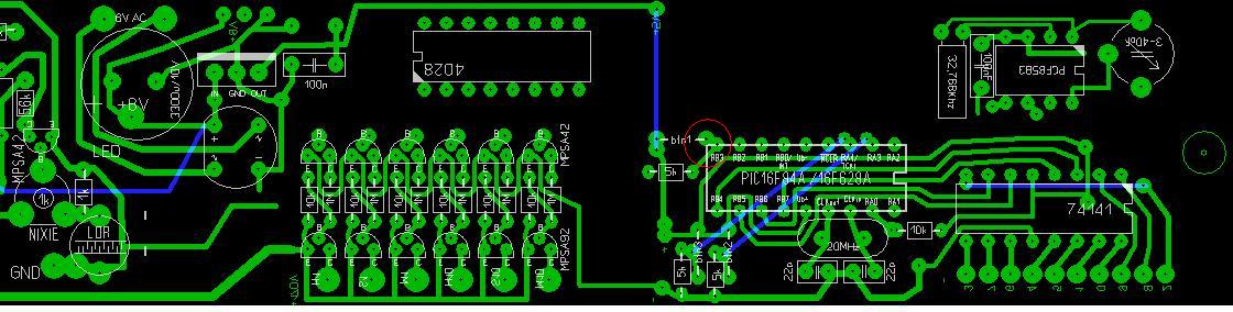 Lásd régebben A gobok szabadon felhasználhatók a kijelző ki/be, a dátum ki/be és az idő beállítására. Most így működik Du. felteszem az utolsó verzió programját, bár nem tudom az rtc és az infra miatt hogyan kellene megváltoztatni az egészet. János ötlete volt, hogy egészítsük ki ezekkel az órát, hogy egy jobb, áramszünettűrő óra legyen belőle. Az A1-6 kimeneteken az anódokat kapcsolgatja egy 4028, a sorrendje tetszőleges, bár én az H10,H1:M10,M1:S10,S1 verziót támogatnám (Lenne még egy ötlet, hogy a 4028 maradék lábaival a kijelző multiplexelése között ledekkel infókat írjunk ki pl. DCF státusz, de ezt még nem jelöltem a rajzon, mert még nem teszteltem le.) Végezetül egy kép a János által utánépített óráról: Kép valamint működés közben az 1.3 verzió: Movie Előre is köszi a segítséget