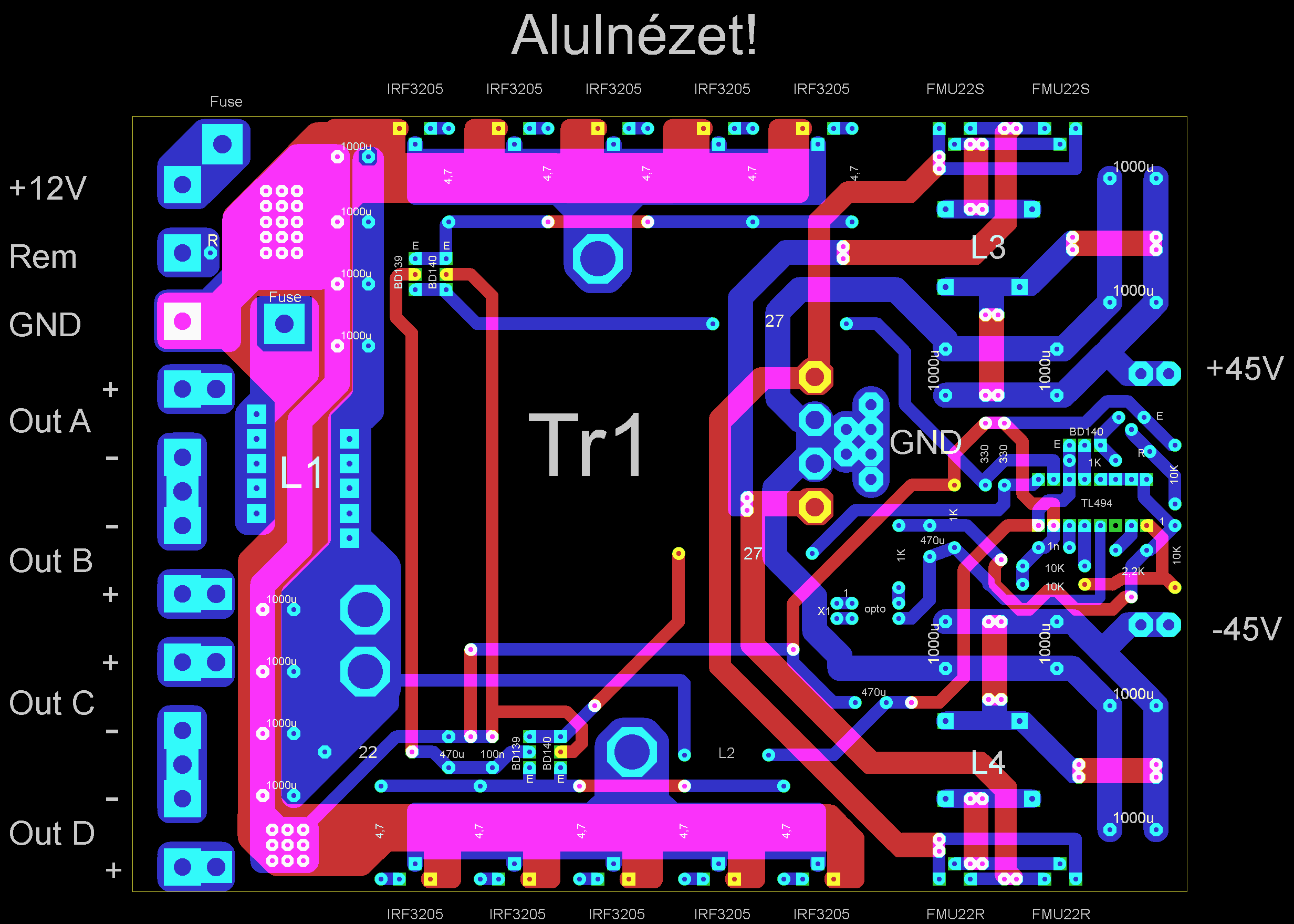 Az az igazság, hogy egy pár órát üldögéltem a gép előtt mire mindent rá tudtam zsúfolni a panelra ( kicsit nagy a trafó, meg volt még 1 pár szabad fet, stb ).