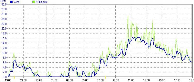 A médiában vasárnapot emlegetnek szeles napként, itt meg kedd-szerdát írnak.....végül is mindegy csak fújjon már egy kicsit erősebben. Ma már volt egy két óra amikor beélesített a hálózatra tápláló rendszer, de még nem tudott ráterhelni, csak készenlétben volt. Kb 5,5km/h-nál ért el 180Vdc-t. (410Vdc-ig kellene felmennie a vezérlő szerint)