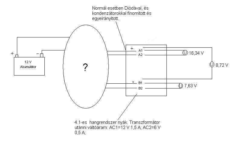 - akkumulátor nem ad stabil 12 V-ot, IC-hez meg legalább 3-4 V többlet feszültség kell. - a nyák táp ellátása egy 16 V, és egy 9 V stabil egyenárammal történik. Szóval, segítséget szeretnék kérni, hogy az akkumulátor és a nyák között milyen kapcsolások jöhetnének szóba. Nagyon örülnék, ha lenne kapcsolási rajz is, de elegendő, ha megmondja valaki, hogy milyen sorrendben tudom a 12 V-ot stabil 16, és 9 V-ra alakítani, illetve az áramerősség hogyan változhat? Mert eredetileg a transzformátor után 1,5 illetve 0,5 A áram folyik át, de ezt egyenirányítva változik valamit? A válaszokat előre is köszi, és légy szíves, felesleges kérdés ne legyen, pl.: minek 4.1 a kocsiba.. Köszönöm