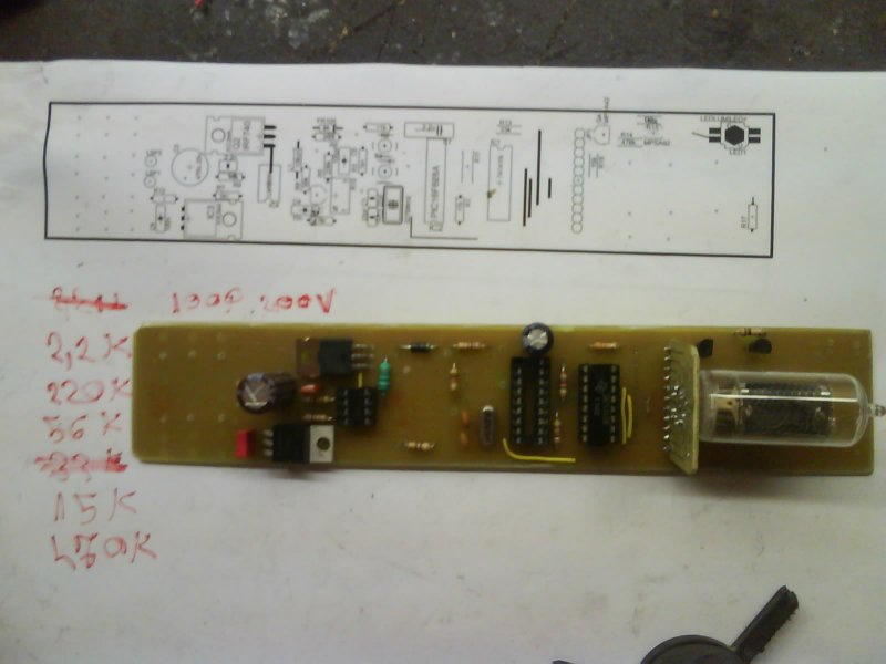 Nagyon szép a felépített óra. A pic programja is készül... Addig is pic nélkül mérd meg, hogy a pic bemeneti lábai vezérelhetők-e, a kimeneti lábait max. 470 ohm ellenállással a földre illetve a tápra lehet-e húzni. Valamikor készítettél egy LED sort a dekóder tesztelésére. Ha még megvan, azzal le tudod tesztelni, hogy a 74141 jól működik. Minden bemenetét (D, C, B, A BCD bemeneteit) húzd le földre - ekkor a 0. kimenete lesz aktív. Ha csak az A -t magasra húzod, akkor az 1., ha csak a B -t, akkor a 2., ha csak a C-t, akkor a 4., ha csak a D-t, akkor a 8. kimenete lesz alacsony szintű... Hasonlóan az anódokat vezérlő dekóder is bemérhető..