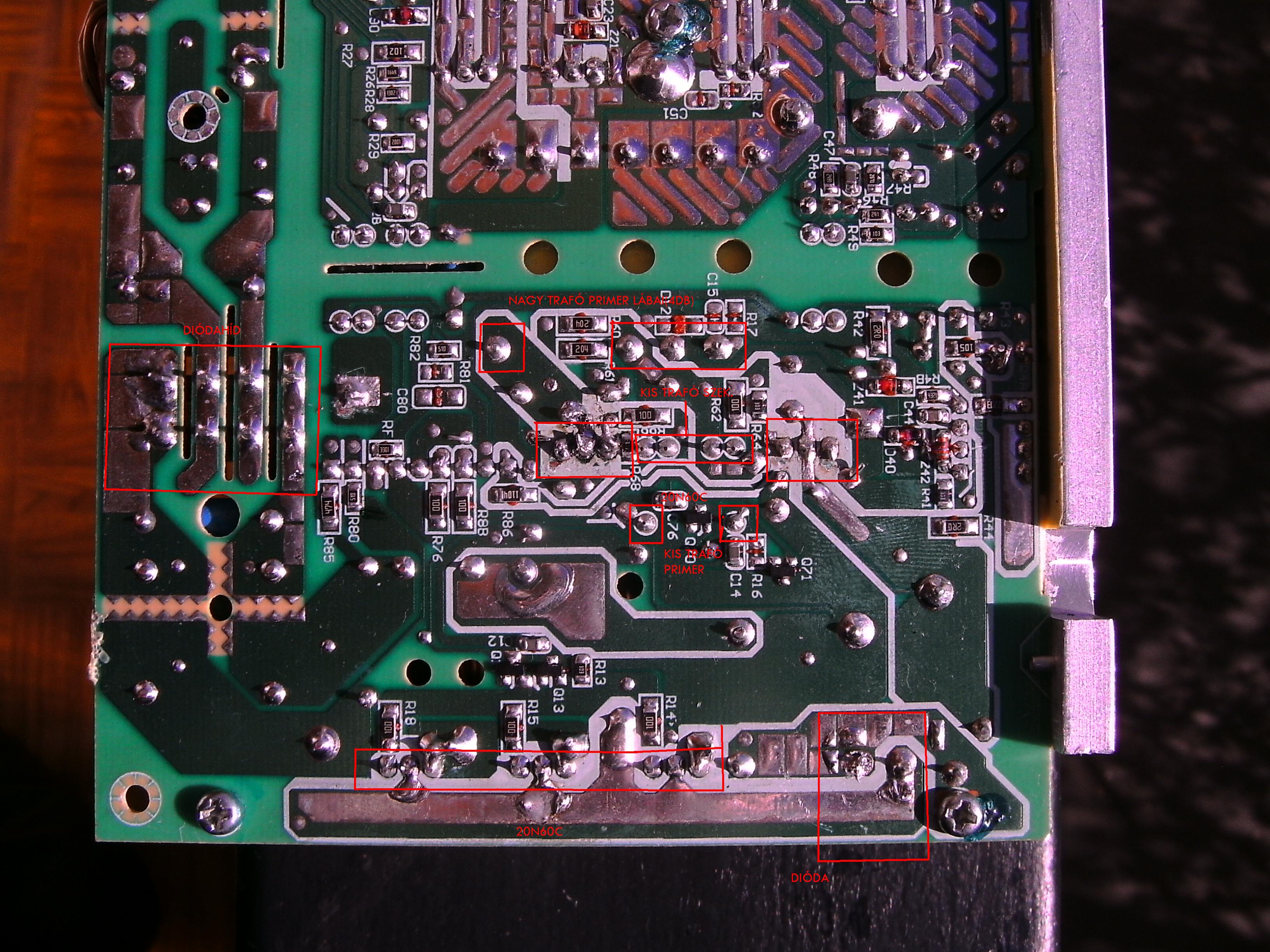 Ebből azt vélem látni, hogy a három FET párhuzamosan van kötve a szélén. Viszont nem látom a fóliarajzot világosan, hogy a nagy trafó hova is kapcsolódik, a kis trafó szerepe sem világos így. A készenléti feszültség hol áll elő? Merthogy a kis trafó egyértelműen a hálózati oldalon látszik a primer és a szekunder oldalával is.
