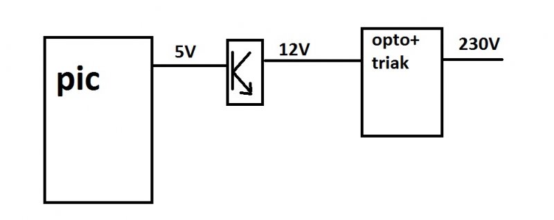 Ekkor egyszerűbb a helyzet: Az optotriak led anódja menjen a +12V -ra, a katódja egy ellenálláson keresztül egy NPN tranzisztor kollektorára. Az ellenállás - 40 mA LED áramhoz - (12-1.2-0.3)/0.04. A tranzisztornak 40mA kollektor áramhoz csak kb. 1-5 mA bázisáram kell, tehát az NPN tranzisztor bázisa kb. 1k ellenálláson keresztül vezérelhető a pic kimenetével. 100mA -ig használható a BC547, 1A -ig a BC639...