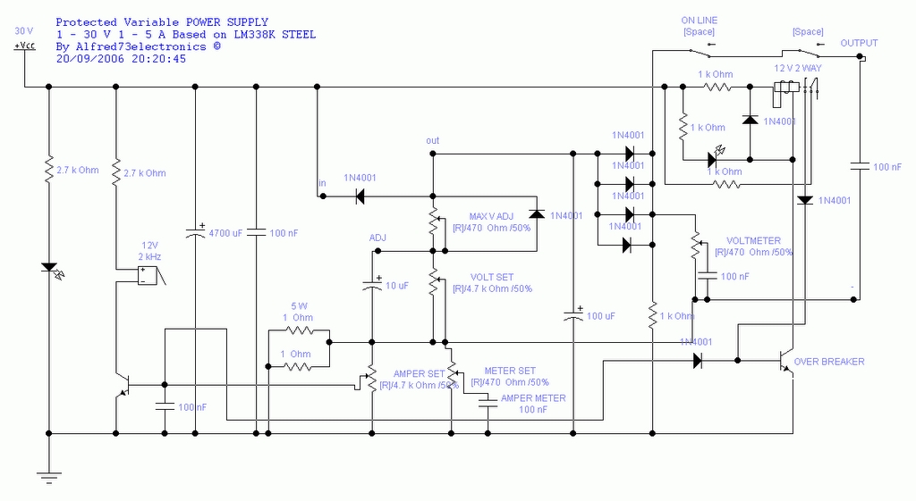 találtam itthon egy LM338K-t és mivel amúgy is szerettem volna tápot építeni ezért gondoltam megpróbálom ezt... vagyis eköré építeni egyet... talátam is egy kapcsolást, de nem nagyon tudom értelmezni vannak rajta számomra érthetetlen dolgok pl. tranyók mellé nincs semmi írva ez nekem azt jelenti, hogy bármilyet be lehet oda rakni. Vagy nem? Aztán a baloldali tranyó felett van egy dolog amit még nem láttam :no: de van tippem sztem egy kristály lehet... nah aztán van pl. ez a ON LINE [space], [space], voltmeter, meter set amper meter, max v adj... lefordítani le tom, csak mivel kezdő vagyok az elektró terén, ezért nem nagyon tom mit jelentenek... egyszóval mit mondtok erre a rajzra? (nekem az fontos hogy szabályozható legyen az áram)