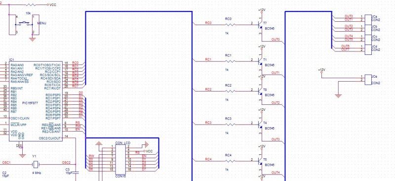 Lenne egy olyan problémám, hogy egy PIC16f877a C portját kimenetre konfigoltam, és tranzisztorokat akasztottam rá, a B-t pedig bemenetre, ahogy azt a mellékelt ábra mutatja, és a B port 4es lábán lévő fesztől függően kirak egy értéket a . . . MENUTESZT4 BTFSS PORTB,4 GOTO $+5 CALL PERGMENTESIT MOVLW 0XE0 MOVWF PORTC GOTO LLL4 MOVLW 0X06 MOVWF PORTC LLL4 BTFSC PORTA,2 GOTO MENUTESZT4 CALL PERGMENTESIT GOTO MAIN Míg 0 van a porton (és a tranyó bázisán), akkor ugye az szakadásként üzemel, de ha kijön rá az ,,1" (5V) akkor át kellene mennie rövid zárba, ami nem következik meg, mert csak 2.5V jelenik meg rajta, és a PIC kimenetén is csak ekkora a fesz, viszont ha megjelenik RB4-en az 5 volt, akkor a kimenet is megemelkedik 2.5-ről 5 voltra... ilyet még nem láttam... :S Mit csináltam rosszul? Előre is köszi a segítséget, üdv: Péter