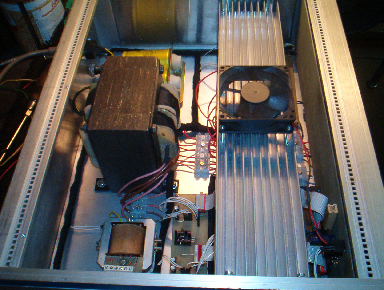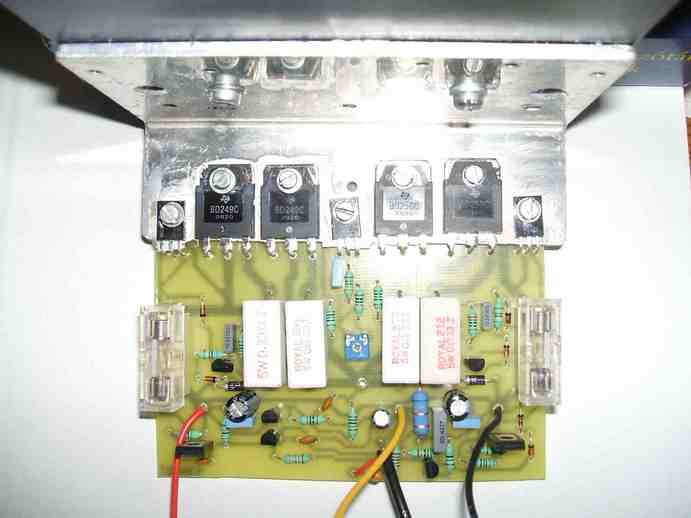 2 db jólismert BDX66-67 es erősítő kapcsolása csak a végtranyók itt nem BDX ek voltak hanem BD139-BD249 és ennek a komplementerpárja. Meg vanbenne egy aluláteresztő amivel akár hidba is lehet kötni és akkor kb 1x200W szinusz. Ja és automata bekapcsolása van.