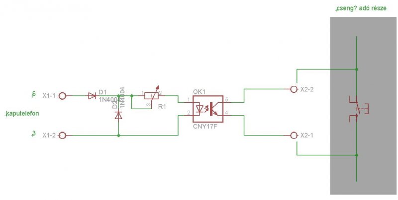 Lenne egy fura ötletem. Nálunk őszintén szólva elég rossz a lakás kialakítása. A kaputelefon kint van az előszobában, és a belső szobákból nem lehet hallani ha csengetnek. Szerintetek megvalósítható a következő ötlet: Vennék egy vezeték nélküli csengőt, aminek a vevő(csengő) része menne a szobába a nyomógombos adó része pedig a kaputelefon mellé. A kaputelefon hangszórójáról vennék jelet, ami egy tranzisztort működtetne. Ha szól a hangszóró jelet kap a tranzisztor ami áthidalja a vez. nélküli csengő nyomógombját ezzel jelet adva a szobában a vevő egységnek. Lerajzoltam kb. mire gondoltam és csatolom a kaputelefon kapcs. rajzát.