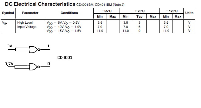 A kérdésem a CD4001-es NOR kapuval kapcsolatos. Az van az adatlapján, hogy: High level input voltage, 5V - os tápegység mellett, minimum 3,5V. Azt szeretném kérdezni, hogy ez azt jelenti -e , hogyha a bemenetén pl: 3,7V megjelenik, akkor a kimenetén logikai 0 jelenik meg. A másik kérdésem az, hogyha egy ilyen IC-t használok, akkor elég oda 3,7V-ot számolnom, vagy inkább menjek fölé ennek az értéknek, hogy biztos jó legyen. A választ köszönöm!
