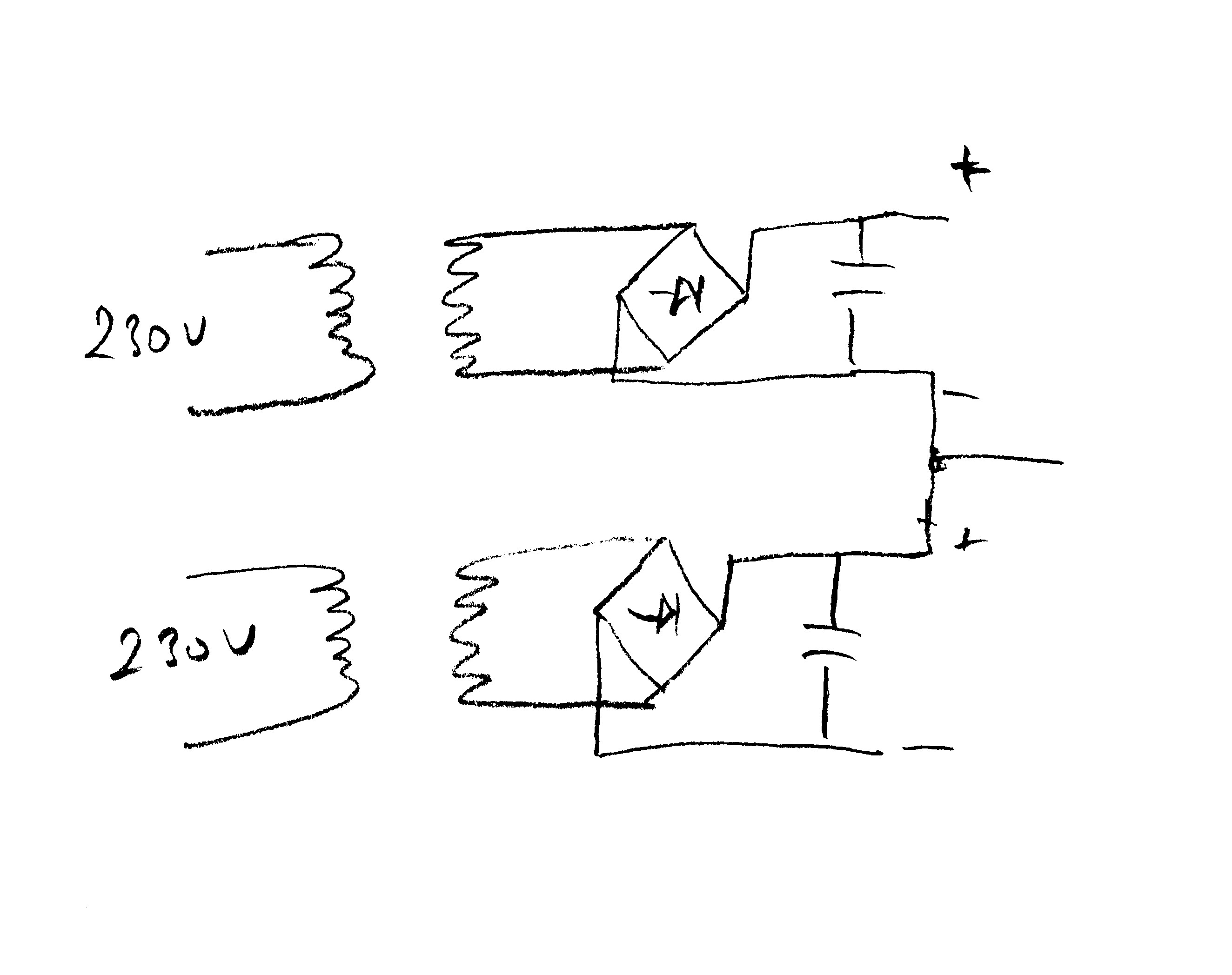 Csináld ezt. CSak + 4 dióda. Az Te változatodnál a primer oldalon mindenféle kiegyenlítő áramok folynának, ami csak melegítené a trafókat.