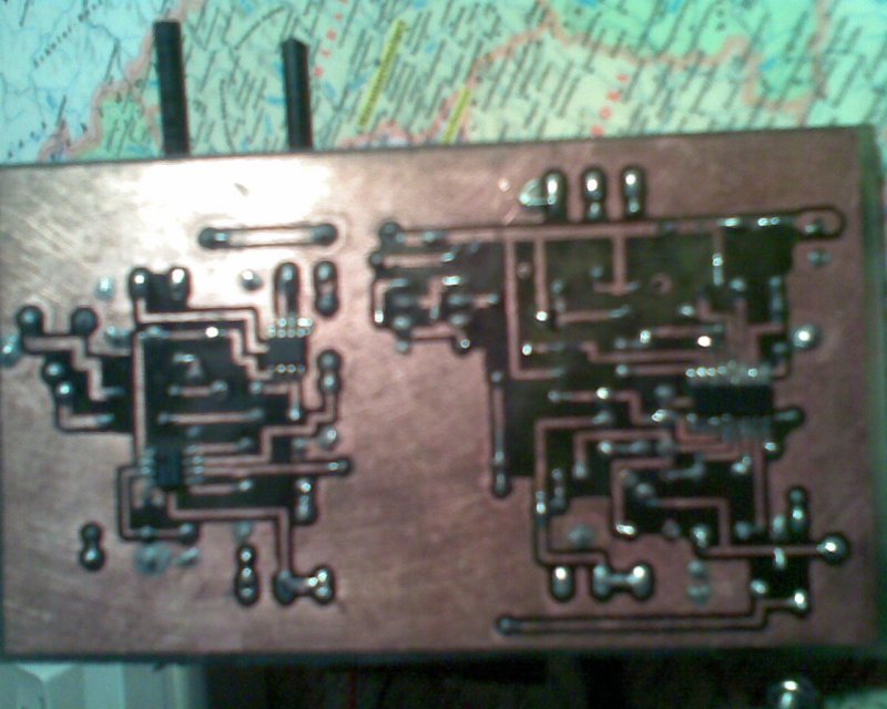 Nekem egyelőre kondis kicsatolás után közvetlenül megy rá az oszcillátor jele az 1. lábra, mert még csak most szereztem be rádiófrekvenciás tranzisztort (BC546 azon a frekvencián már nem akart nekem túl sokat erősíteni, bár pontosan mérni se tudtam, nincs woblerem, csak annyit vettem észre, hogy vele és nélküle is ugyanúgy működött /közös emitteres kapcsolásban, bázisáramos munkapontbeállítással/). Nekem eleinte nem 2-3szorosan bár, de eltért a frekvencia a névlegestől, magyarul rosszul osztott, de mióta hagyom a levegőben lógni a 8. lábat, (előtte a kicsatolókondival azonos értékű, 2,2 pikós volt rajta a föld felé), azóta pontos. A leosztott frekit mérőkártyával mértem, szoftveresen visszaszoroztam, és annyit mutatott, amennyit kellett (92,4MHz vételi frekinél 92,33-at, persze még a PLL előtt, feszültséggel hangolva). Bár lehet a dugdosós panel miatt is rakoncátlankodik.Mindenesetre ha panel lesz neki, beletervezem a kicsatoló tranzisztoros fokozatot is, valamint a kondit a 8. lábra. Otthon meg majd lerajzolom és lefényképezem. Egyébként egy hét alatt állt ez össze.. minden részegységet elég alaposan teszteltem, mielőtt teljesen összeraktam.