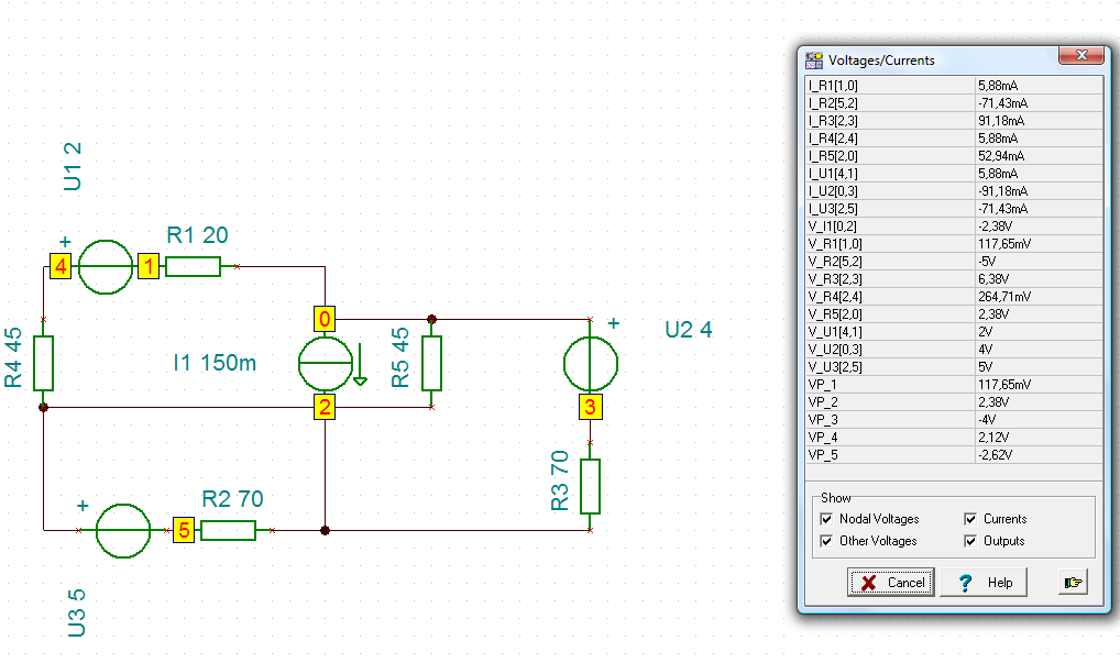 ![]() A kérdéses ellenálláson eső feszültségek: U1=0,97V (2V-os generátorral) U2=2V (áramgenerátorral) U3=0,76V (4V-os generátorral) U4=0V Eszembe jutott, hogy úgy 15 éve a középsuliban egy Tina nevű programmal szimuláltunk hálózatokat és az egész jó volt. Csodák csodájára még létezik a program (mi több, új kiadásai vannak) és az OrCAD-hez képest egy felüdülés a kezelése, szóval a helyes eredmény: U=-U1+U2-U3=0,27V.