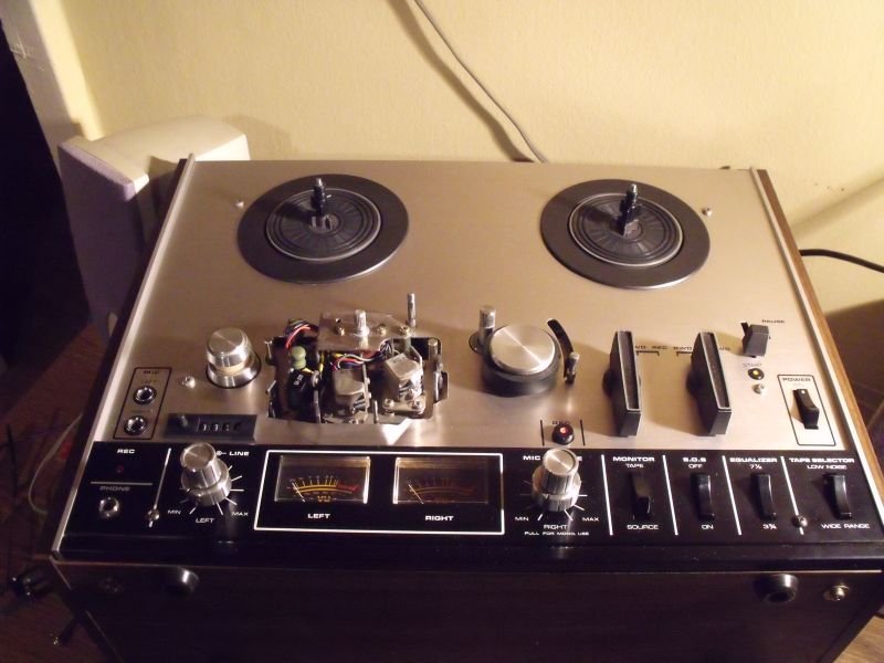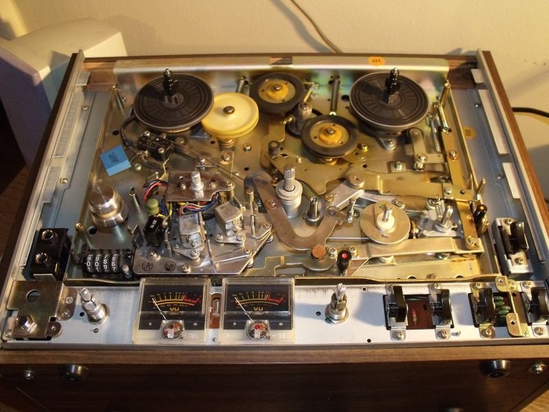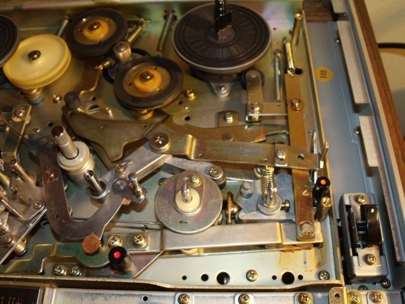 spatulával lenyomni a kisnyelvét belevilágítani a szájacskájába, hát volt benne apró mennyiségű por, de nem vészes, kicsit törölgettem, fúvogattam, egy csepp olajat kapott a nyomógörgő tengelye, a fejek szinte kopásmentesek, gyönyörűek, capstan rendben van, a sebességbeállító gyűrű is megvan nekijje, plexije szinte karcmentes, tekerése mindkét irányban rendben van, felvétel, lejátszás hibátlan, egyetlen apró gondja van, bal irányba tekerésből leállítva a jobb oldali orsó nem fékez be, így egy kis szalagrész letekeredik. Gondolom, ez a korral jár, de orvosolható, ma még nem volt időm behatóbban foglalkozni a géppel, egyelőre megkapta az "ahol a papok táncolnak" típusú takarítást. A törlőfejen volt kis ragacs maradék, azt finom papírral letöröltem, de még alkohol vagy ilyesmi tisztítószer , ami pillanatnyilag nem állt rendelkezésemre, nem érte a fejeket. Ahogy lehet, erről is töltök fel képeket. Úgy tűnik azonban első látásra, hogy ez a magnó az örökkévalóságnak készült, annyi fém van benne, hogy a Krivoj Rog-i orosz fémbányák idejöhetnének kuncsorogni nyersanyagért....