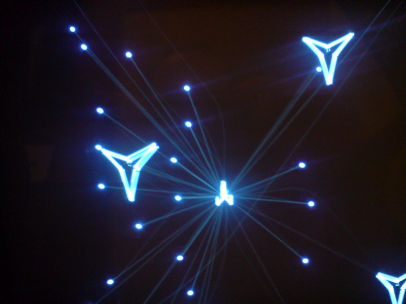 A szkópcső/képcső grafikus, vektoros felhasználására jó példa a VECTREX nevű videojáték 1986-bó. Az eltérített sugár a képernyő közepéből indul kirajzolja az összes képelemet, majd ugyanoda tér vissza. A fényerőt az eltérítés sebességével szabályozták (azt hiszem). Ime pár kép, amit feltekert fényerővel készítettem, hogy a sugár útja is látható legyen. Szöveg kírásánál külön sor, oszlopos eltérítő rutint alkalmaztak.