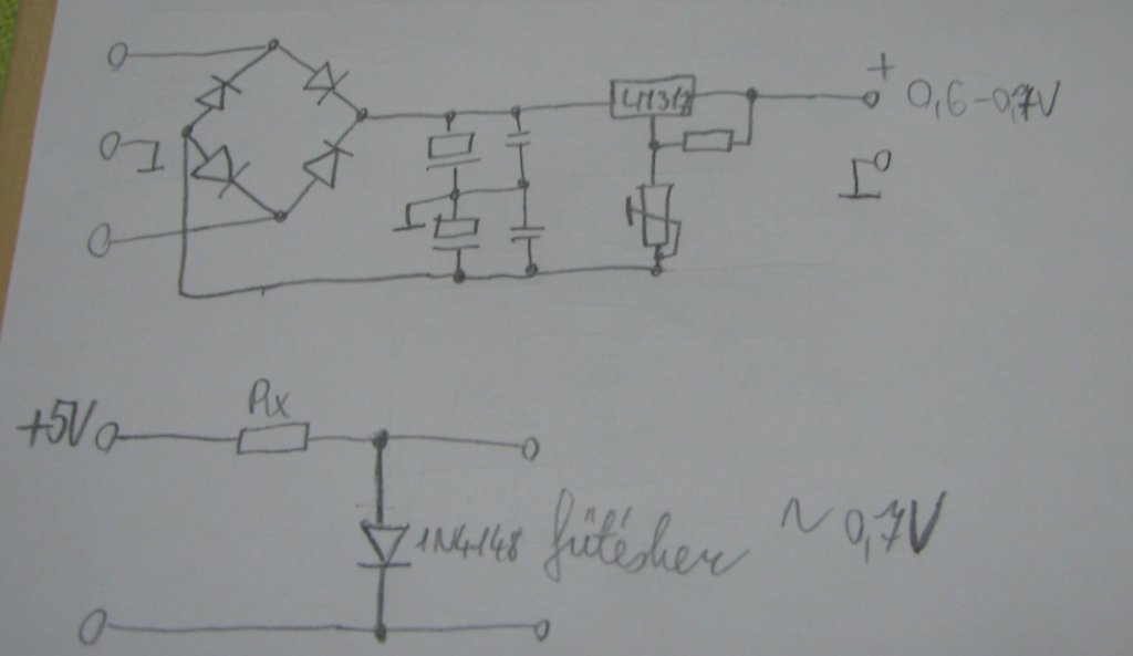 LM317 1,2 V-ra, és a kiementre sorosan néhány dióda.