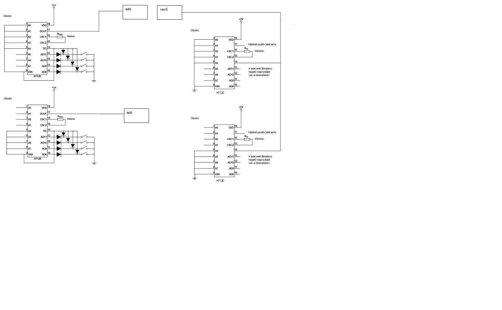 Én arra írtam hogy nem jó, hogy 5V-ot adsz valamelyik bemenetre, mivel testel kell vezérleni, és a HT12D is negatív kimeneti jelet ad.