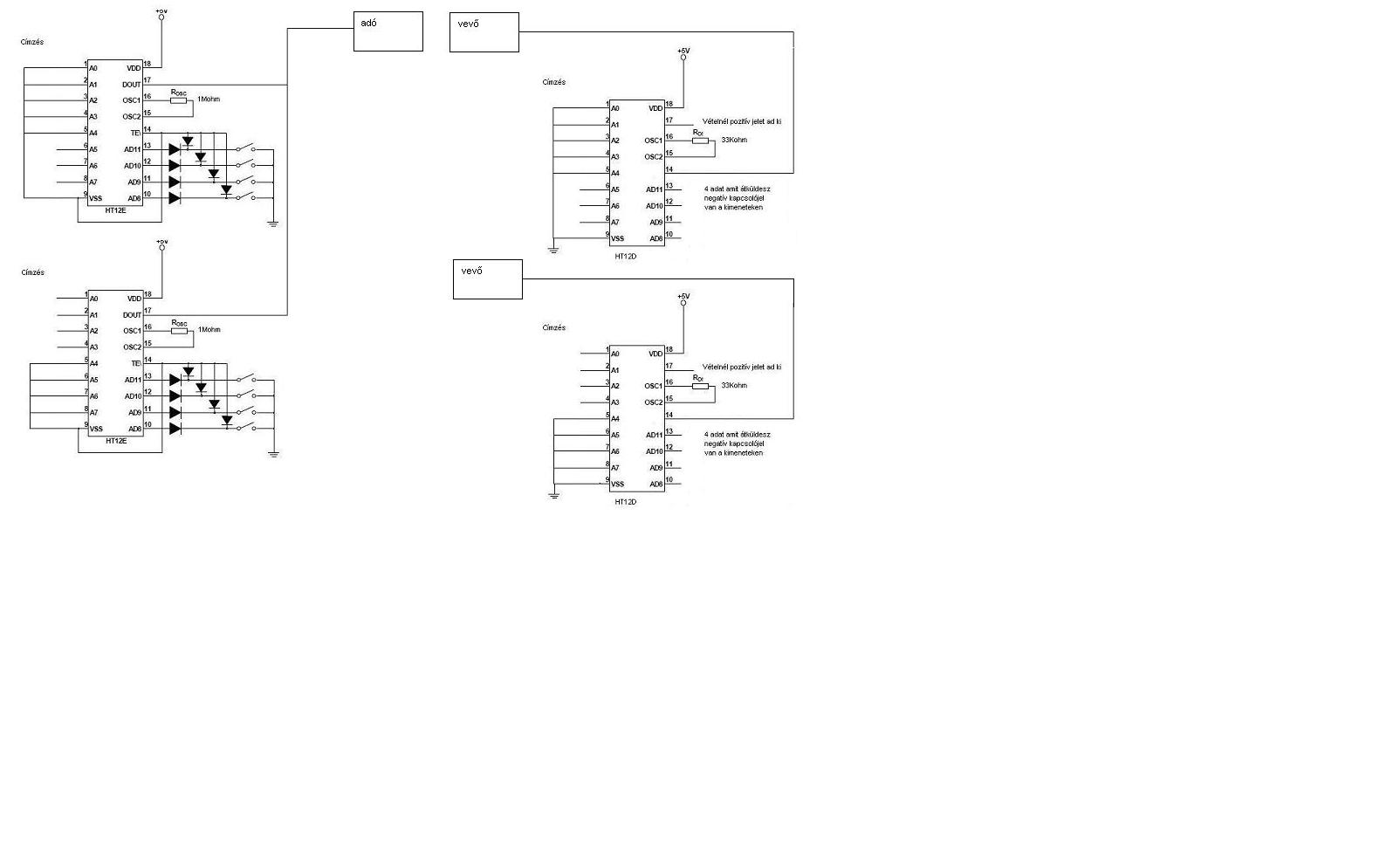 Én arra írtam hogy nem jó, hogy 5V-ot adsz valamelyik bemenetre, mivel testel kell vezérleni, és a HT12D is negatív kimeneti jelet ad.