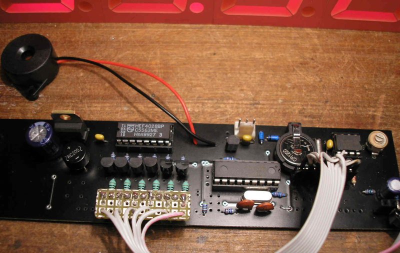 Csak ízelítőnek néhány gondolatban és képek a készülő nagy ledkijelzős óráról. A kontroller PIC16F628(A). A programot Hp41C írta, a nyákterveket, kapcsolástechnikát Sooty készítette. Mule2 néven egy többfunkciós hatcsöves nixie óra készül, ebből jött aztán a gondolat, mi lenne, ha ezt hétszegmenses ledkijelzőkkel is elkészítenénk. Már működik a próbaverzió, nem tartalmaz egyetlen kezelőgombot sem. Néhány alapfunkció az óra működéséről.. RTC, teljeskörű infra távvezérlés RC5 protokollal, DCF77 szinkron. Hangjelzés egész órakor, egy, vagy ahány óra van, és idő intevallum tól-ig a hangjelzés engedélyezésére. Nappali/éjszakai fényerő 8/8 fokozatban. Nyolc beállítható ébresztési időpont, DCF szinkronok száma, évszázad kijelzése, stb. Minden beállított adatot az RTC-ben tárol a program, amit egy 3V-os gombelem táplál, ha éppen nincs áram alatt, ezért nem felejti el az időt és a beállított adatokat sem. A vezérlő panelen a PIC, az RTC, és egy BCD CD4028 IC van, ez kapcsolgatja multiplexben a kijelző modulok mind a hat katódját egy-egy BC337 tranzisztoron. A panel tartalmaz egy SN74141 nixie meghajtót is , de erre itt most nincs szükség, csak a D,C,B,A bemeneteit vezettem ki a tápfeszekkel együtt egy külön kis panelen helyet foglaló hétszegmens dekódoló, (CD4543), és egy szegmensmeghajtó ULN2003 tranzisztormező alkalmazásával.A program és a hardver finomításai még folynak...