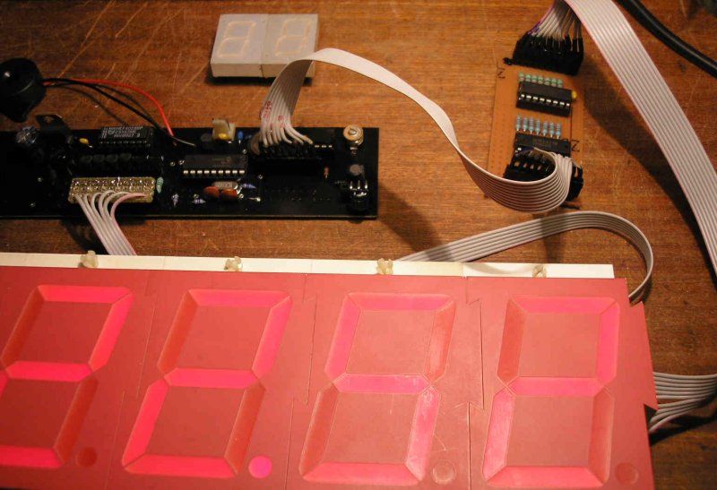 Csak ízelítőnek néhány gondolatban és képek a készülő nagy ledkijelzős óráról. A kontroller PIC16F628(A). A programot Hp41C írta, a nyákterveket, kapcsolástechnikát Sooty készítette. Mule2 néven egy többfunkciós hatcsöves nixie óra készül, ebből jött aztán a gondolat, mi lenne, ha ezt hétszegmenses ledkijelzőkkel is elkészítenénk. Már működik a próbaverzió, nem tartalmaz egyetlen kezelőgombot sem. Néhány alapfunkció az óra működéséről.. RTC, teljeskörű infra távvezérlés RC5 protokollal, DCF77 szinkron. Hangjelzés egész órakor, egy, vagy ahány óra van, és idő intevallum tól-ig a hangjelzés engedélyezésére. Nappali/éjszakai fényerő 8/8 fokozatban. Nyolc beállítható ébresztési időpont, DCF szinkronok száma, évszázad kijelzése, stb. Minden beállított adatot az RTC-ben tárol a program, amit egy 3V-os gombelem táplál, ha éppen nincs áram alatt, ezért nem felejti el az időt és a beállított adatokat sem. A vezérlő panelen a PIC, az RTC, és egy BCD CD4028 IC van, ez kapcsolgatja multiplexben a kijelző modulok mind a hat katódját egy-egy BC337 tranzisztoron. A panel tartalmaz egy SN74141 nixie meghajtót is , de erre itt most nincs szükség, csak a D,C,B,A bemeneteit vezettem ki a tápfeszekkel együtt egy külön kis panelen helyet foglaló hétszegmens dekódoló, (CD4543), és egy szegmensmeghajtó ULN2003 tranzisztormező alkalmazásával.A program és a hardver finomításai még folynak...
