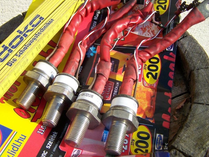 Az egyszerűbb megoldás érdekelne ... Először én is három tirisztorral akartam de a diódák menete nem illeszkedik a tirisztorok hűtőbordáinak menetéhez pedig szeretném ha hat egyforma cucc lenne . A másik baj hogy nincs M16X1,5 mm-es menetmetszőm (ilyen menet van a hűtőbordákban ) - M18-asból viszont van menetfúróm és metszőm is . Esetleg M18-as menet fúrással-vágással tudnám a három diódát mellé illeszteni három tirisztorhoz .