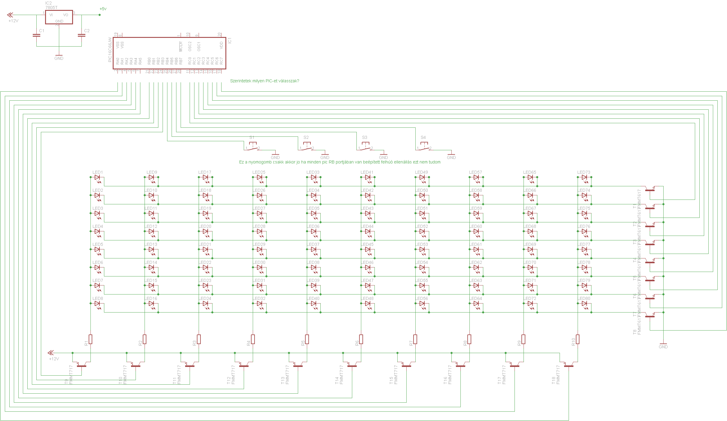 Jó választás a 28 lábú tok, sokféle típust lehet felhasználni az áramkör átalakítása nélkül: 16F886 - 8Kszó, 18F2420 - 16kbyte, 18F2520 - 32kbyte, 16F2620 - 64kbyte. Az áramkörről: A 12V-ot kapcsoló tranzisztorok meghajtása nem lesz így jó. Mindegyikhez ajánlanék egy npn tranzisztort: Az npn tranzisztor emittere a földre, a bázisa egy ellenálláson keresztül a pic kimenetére, a kollektora egy ellenálláson a pnp tranzisztor bázisára kapcsolódik. A pnp bázisa és emittere közé is tennék egy ellenállást a biztos lezárás elérésére.