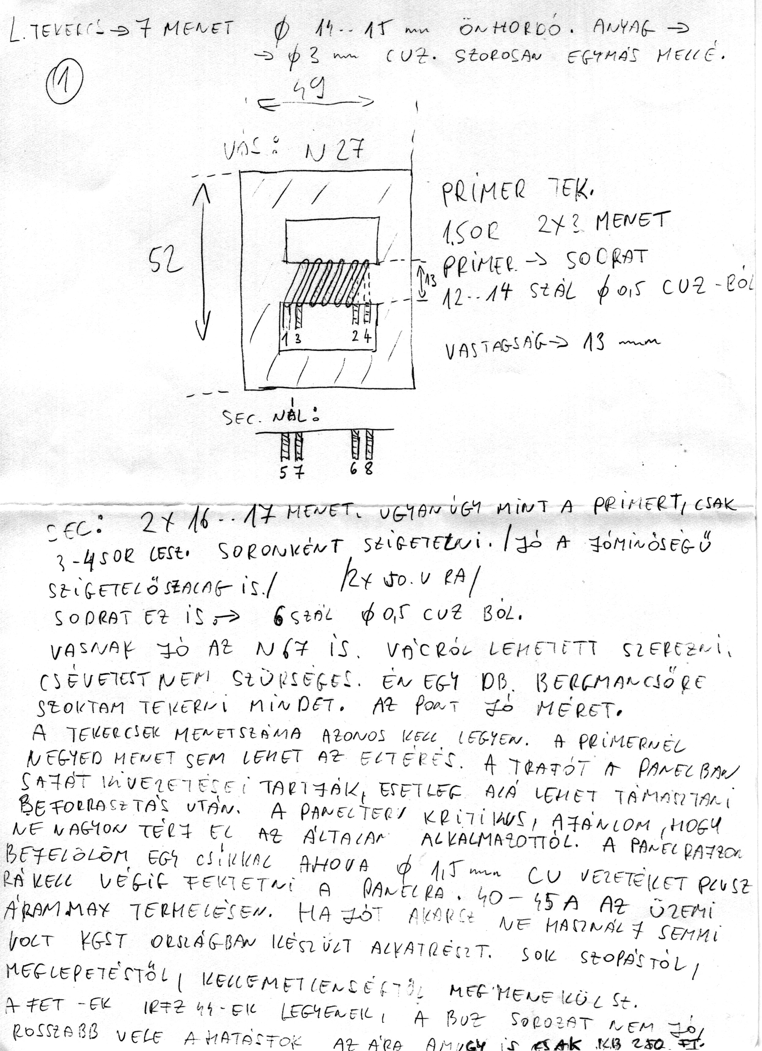 Hát először megcsinálom a nyákot olyanra ahogy a gyári rajzon van.Akkor atrafót későbbre hagyom.A kondival az a baj hogy HEstore oldaláról fogok rendelni és ott a 4700µF kondiból csak 63V-ig van.Így maradtam a 60V os kimenő feszunél hogy azért ne legyen a maximum maximumáig hajtva a kondi.Van egy leírás atrafóról>Én ebből azt veszem ki hogy a primer az 2x3 menet a szekunder pedig 2x16..17 menet.Viszont ott ír valami 12...14 szál at 0,5-ös drótból???az mi lehet?Mert az L tekercset azt értem.Az 7 menet 3as drótból.Önhordós.