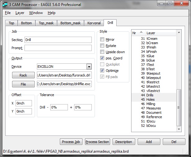 Gerber fájlokat próbálok készíteni (először) egy panelhez. Egy interneten lévő leírást követtem: Bővebben: Link A leírtak alapján végeztem mindent, csak végül a CAM processor dobott egy hibát (mellékeltem) és nem tudom, hogy minek. A .drl fájlt az ULP-vel rendesen legeneráltam, és a kimenetben, a .dri fájlban nincs meg mind a 112 furat, hanem csak 58 van. Valószínű valami egyszerű hiba, amit nem tudok. Amúgy a többi gerber fájlt megalkotta, bár nem tudom hogy ez a hiba kihatással volt-e rájuk. Ha valaki tud rá megoldást, kérem ossza meg. Köszönöm! Üdv!