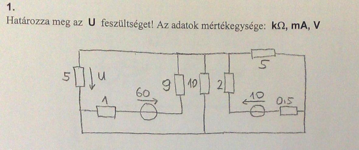 a kapcsolás, utána akár szuperpozícióval is könnyen megoldható. Ha ekkor a függőleges ágakban folyó áramok megvannak, akkor számítható a 2-en folyó áram és ebből a feszültség.