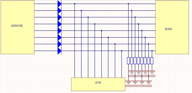 Mivel a diódás megoldásnál az ADS ic nem tudja a memória bemeneteit íráskor GNDre (logikai 0) húzni (mert a diódák záróirányban vannak) akkor ezt elvégzik a lehúzó ellenállások. Gondolom gyors diódák kellenek majd (gyorsabb mint 15ns)