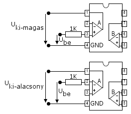 A plusz bemenetre kötsz egy 1K ellenálláson + tápot akkor megkapod a magas kimeneti feszültséget ,ha ugyanezt a - ra kötöd megkapod az alacsonyt.(2, 3 láb) .