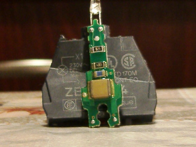 Nem kellene ilyeneket írni. Egyet a kedvedért szétszedtem, ez egy Moeller gyártmány. Mivel AC-DC üzemre készült, egy diódahíd, pár ellenállás, és egy kondenzátor van benne. Semmilyen nyitóirányú védelem nincs benne a LED részére.