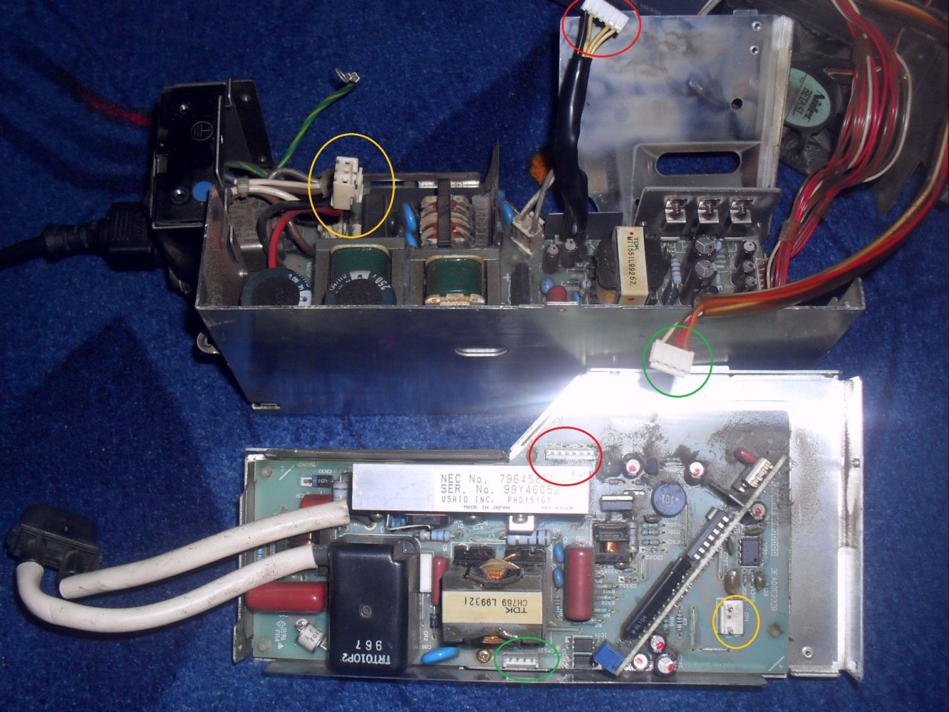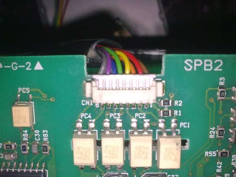 Van a kábel, ami az alaplapra megy a lámpa tápegységtől. Ebből az egyik vezeték GND (a legnagyobb fémfelületekkel össze van kötve), egy másik vezetéken van kb. 2-2.5V. Ez utóbbit kell GND-re húzni egy kb. 1kOhm-os ellenállással.