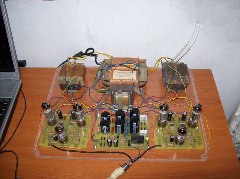 Összehasonlítva az ECL86 SE-vel a hangképet kiderül, hogy mélyben és magasban kissé sávhatárolt de ezt a junoszty trafók számlájára írom. A katódkondik nem jó helyen vannak, mert majd felforrnak a csövek melegétől még így is, hogy nincs dobozban. Átkerülnek majd a nyák aljára.